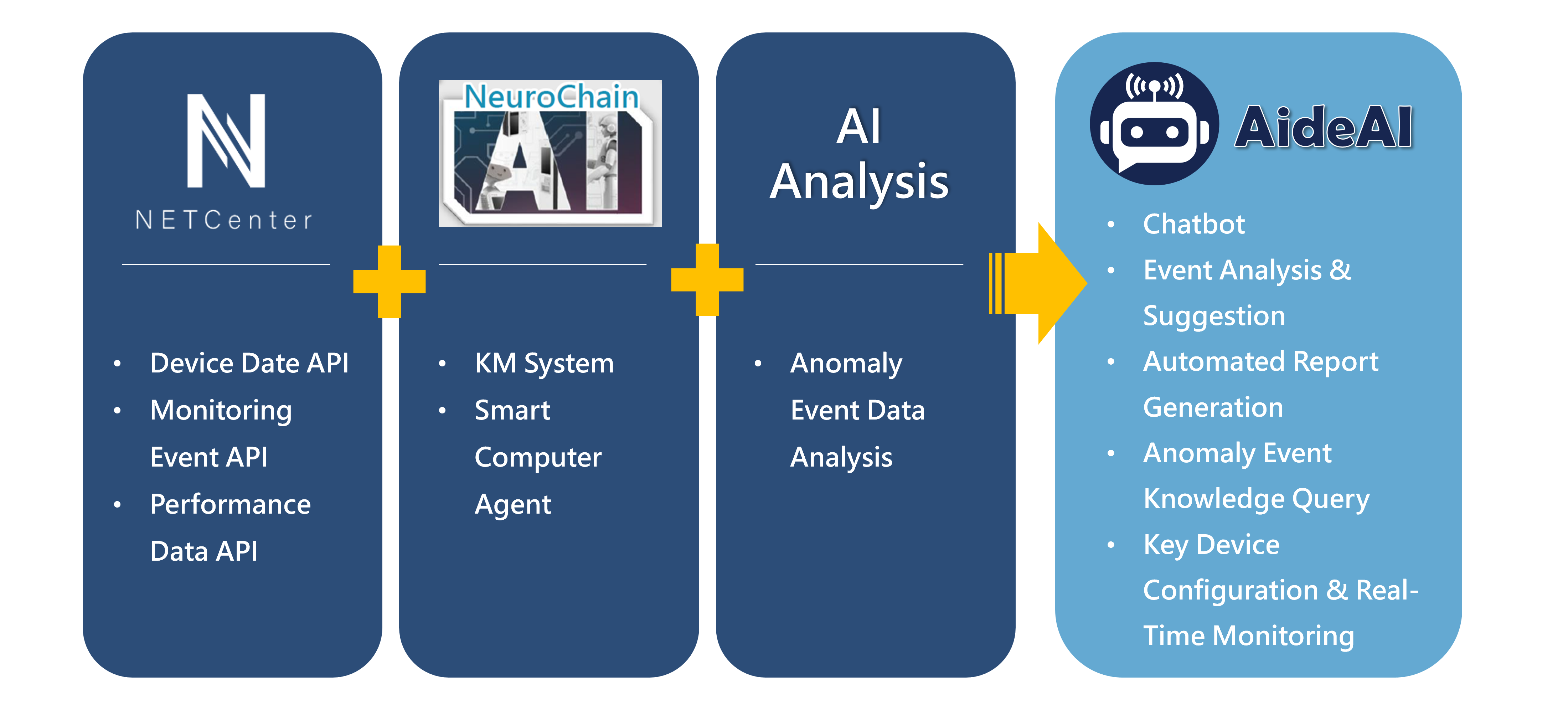 In recent years, the overall demand for IT monitoring capabilities and operations personnel has surged. However, IT operations teams face challenges such as staffing shortages, recruitment difficulties, and retaining experienced employees. These issues have led to increased risks in frontline monitoring and management. In this competition, NETCenter combined NeuroChain, LLM, and NETCenter (ETL) technologies to launch AideAI (Virtual Computer Assistant). AideAI can use natural language to assign tasks, retrieve relevant data from NETCenter, and automatically generate performance reports. It also analyzes large amounts of data collected by NETCenter to predict potential risks related to abnormal events. AideAI proactively provides reminders and improvement suggestions, helping to achieve intelligent IT operations management.
