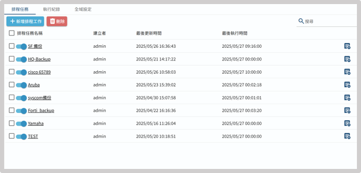 执行显示目前设备即时运作设定、触发动作等操作,批次取得 running-config进行比对与备份。