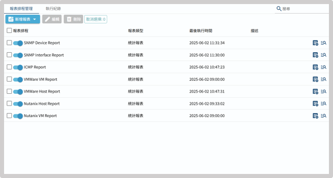使用者可于排程中自订报表目标与产出週期,以利精准掌握系统运作趋势与资源使用情况。